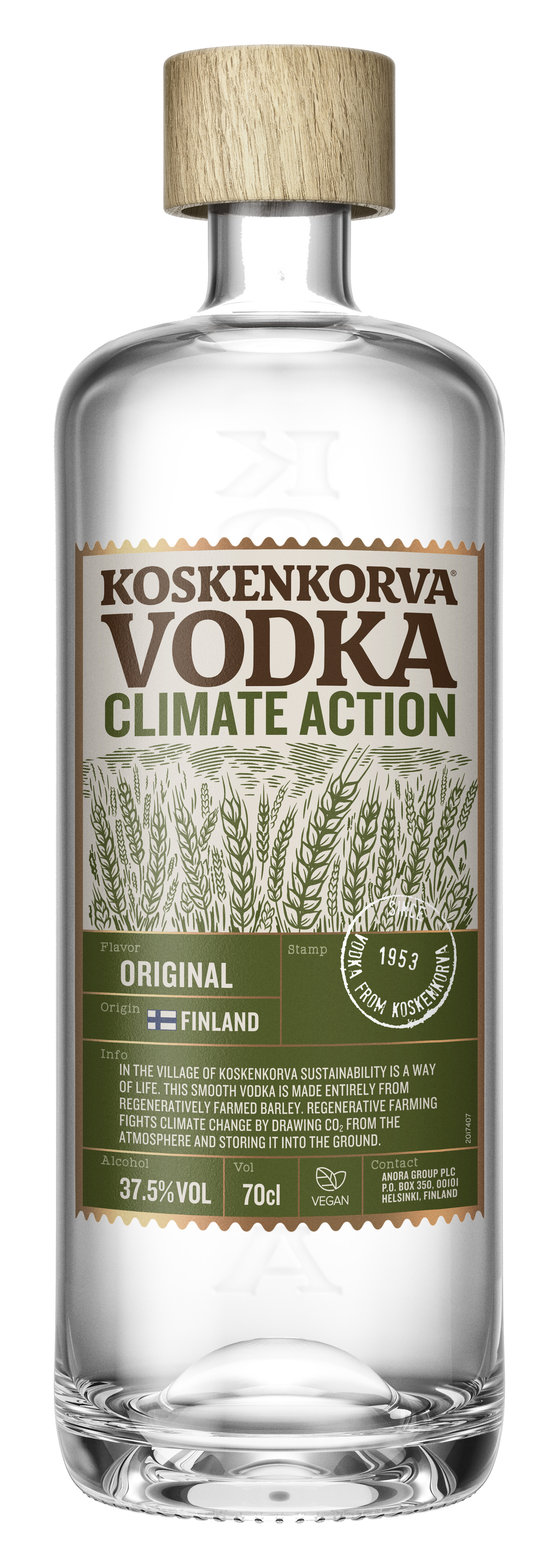 Första vodkan i världen helt tillverkad av regenerativt odlat korn. Innovationen är resultatet av Anora´s samarbete med Baltic Sea Action Group och en lokal bonde. Det första regenerativt odlade kornet odlades på bonden Jari Eerola ´s egendom i södra Finland under sommaren 2020. Regenerativt jordbruk tar bort överskott av CO2 från atmosfären och lagrar det i marken, vilket minskar koldioxidutsläppen samt förbättrar den biologiska mångfalden, minskar erosion och gör jorden mer näringsrik vilket möjliggör större och säkrare skördar.